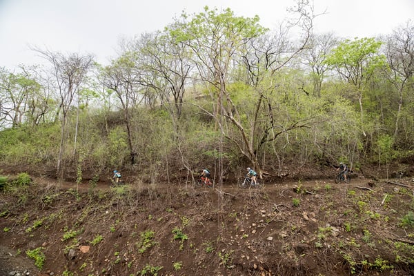 Marking the beginning of the official Las Catalinas Reto route, Inicio is a gentle climb from the trailhead through the lowlands of the tropical dry forest reserve, swooping through two seasonal streams before tacking up the hillside to converge with Principal. Inicio has a moderate elevation gain and is an easily accessible route for any rider entering the trails.