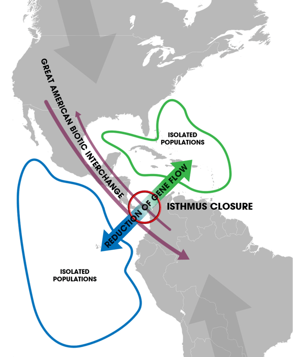 (The creation of the isthmus of Panama caused an isolation of Pacific and Caribbean species, as well as a biotic interchange between South and Central American species | PC: Commons)